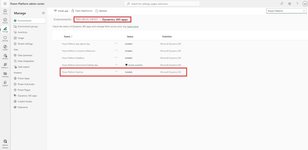 Click on Install app to search for Power Platform Pipelines App