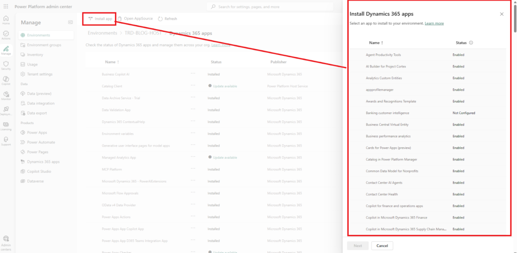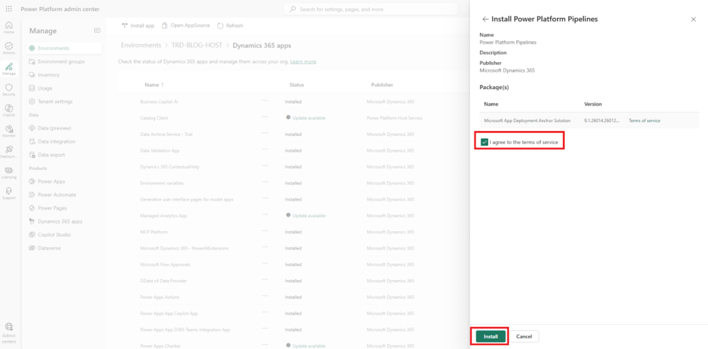 In this section, we will install the Power Platform Pipelines D365 apps to implement ALM for our project, which includes both the Development and Pre-prod environments..
